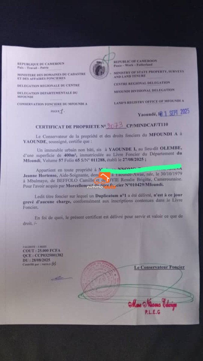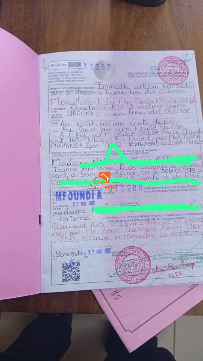 terrain titré à vendre à olembé stade , accès du site praticable, la documentation est disponible ,superficie 400m2, prix 35 mille/m2