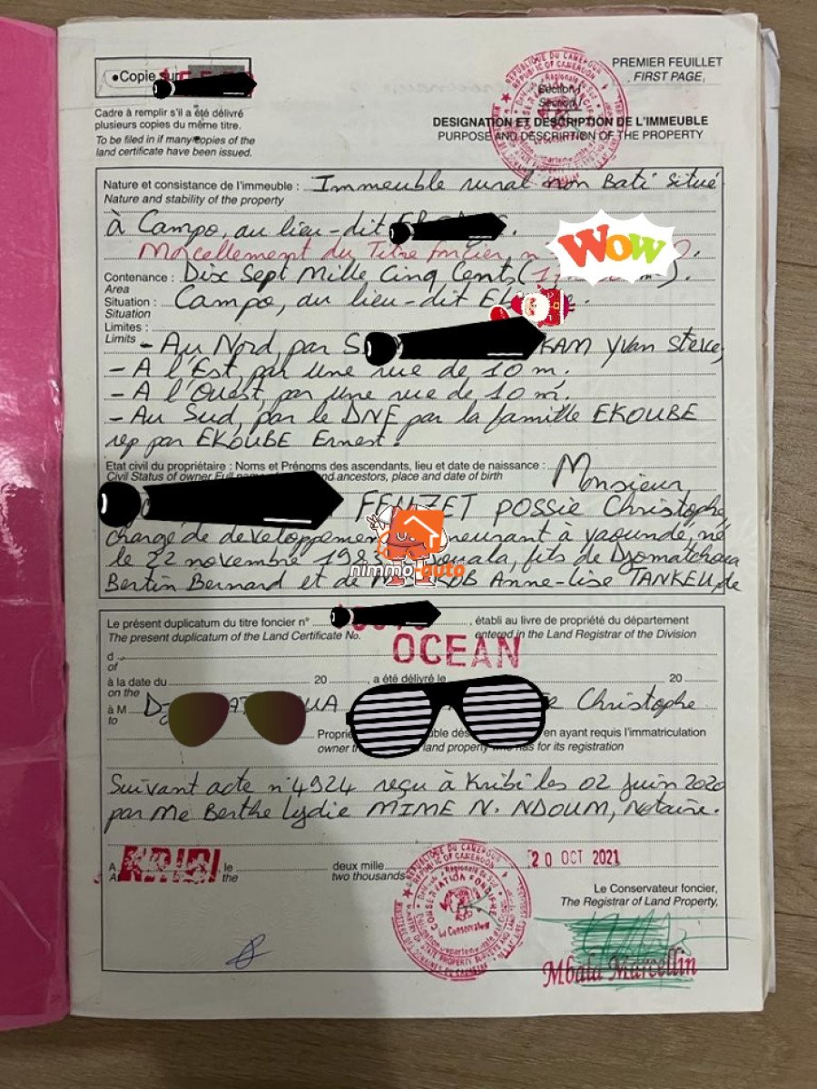 Kribi en bordure de route principale près du port autonome, dans une zone totalement viabilisée pour une superficie de 1.7ha (17000m²) Mutation totale, 1 signataire 16.000 FCFA/m² légèrement négociable. Transaction devant notaire si intéressé.