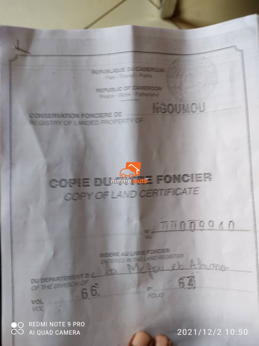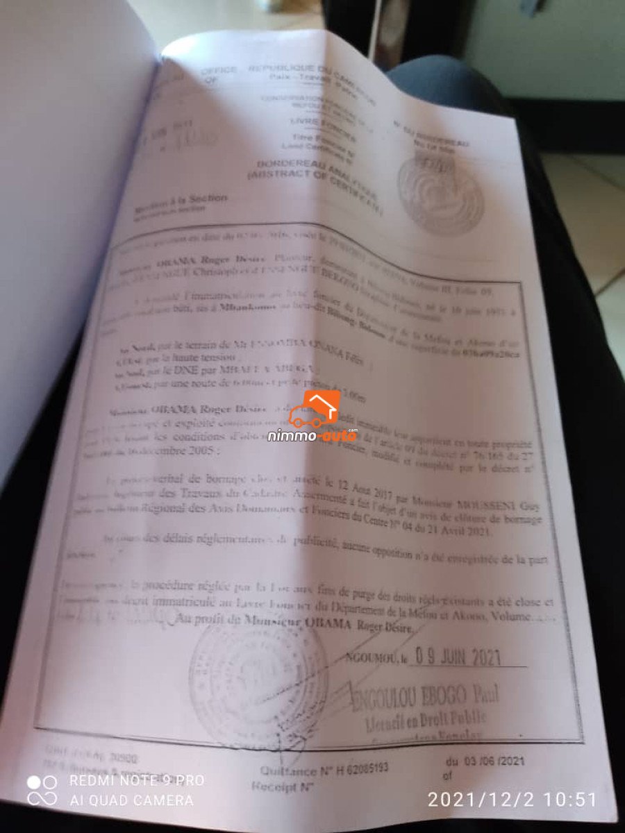 Terrain titré lotis à vendre à eloumden 2 après arabe contractor en bordure de route Superficie:500m2 prix:15000/m2.